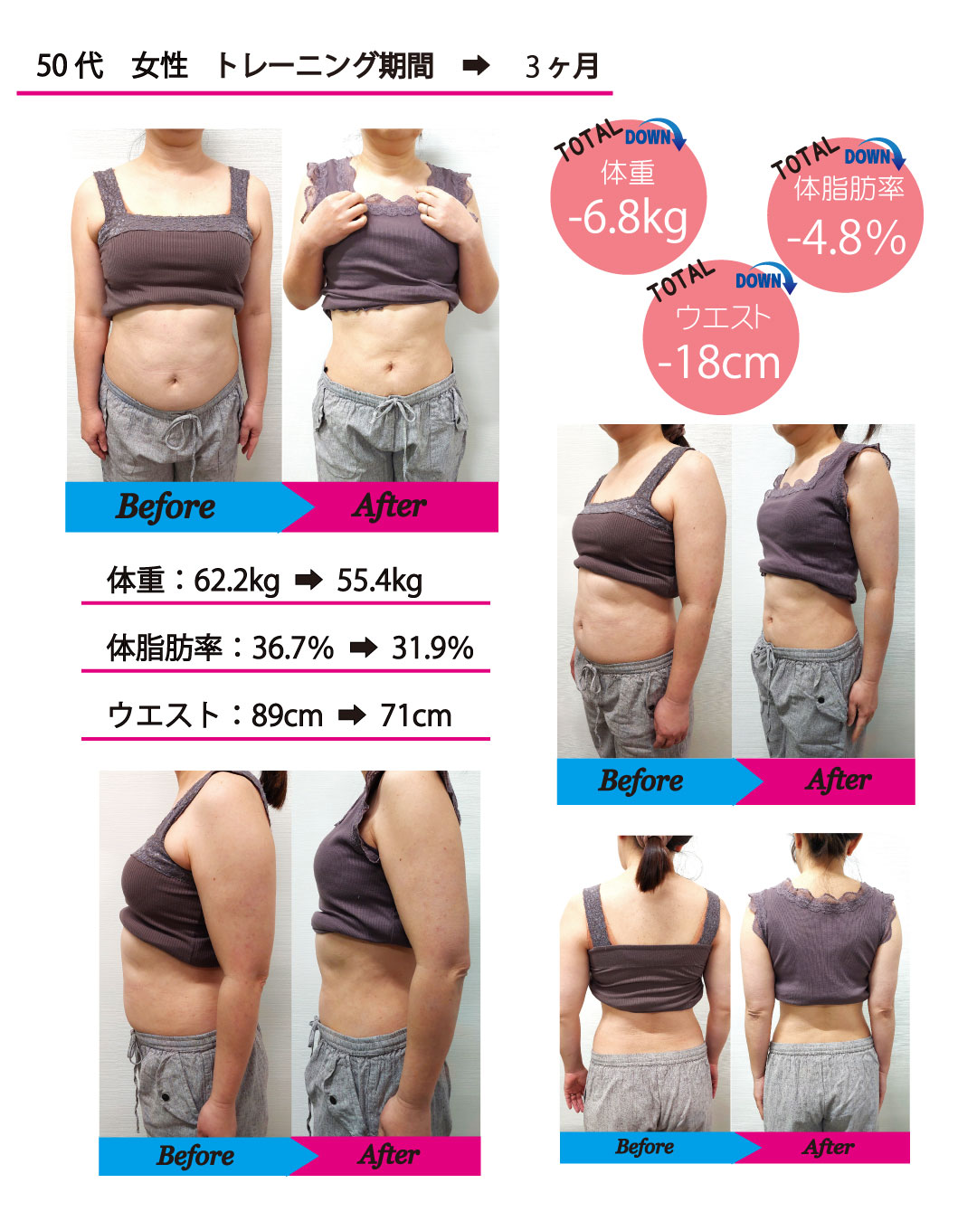 今回は、3ヶ月間トレーニングを頑張られた50代女性会員様のビフォーアフターをご紹介します。